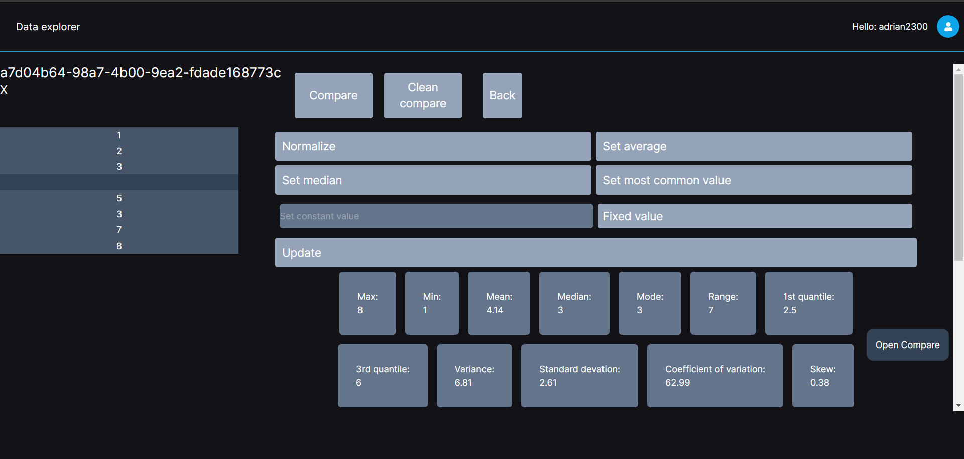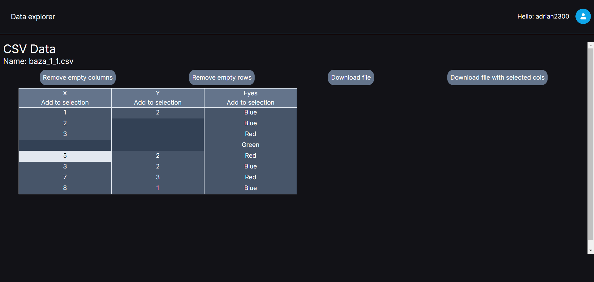 As part of the work division, I was mainly assigned to backend tasks. There, I created appropriate routes that enabled operations such as file saving, setting the mean, updating files and columns, etc. Occasionally, I also made some small changes in the frontend, such as adding a button or improving the display of empty columns and rows in a different color.