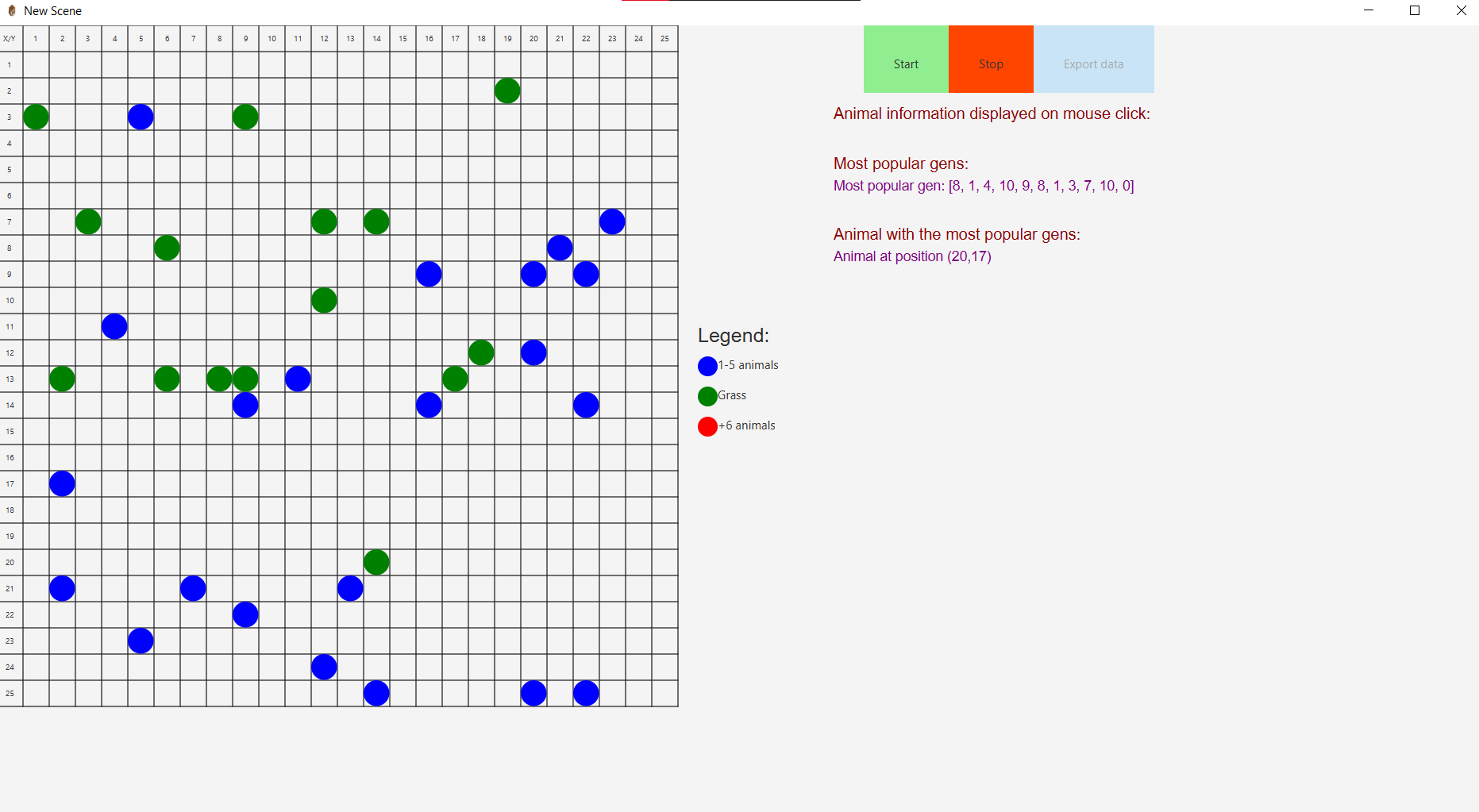 Project involves creating a simulation of animal evolution in a habitat consisting of steppes and jungles. Animals move, eat plants, reproduce, and evolve based on genes. The simulation also includes various interaction variants between animals and their environment, such as consumption, reproduction, and genetic mutations. The application is to be implemented in JavaFX, allowing users to configure and track simulations, as well as generate statistics.