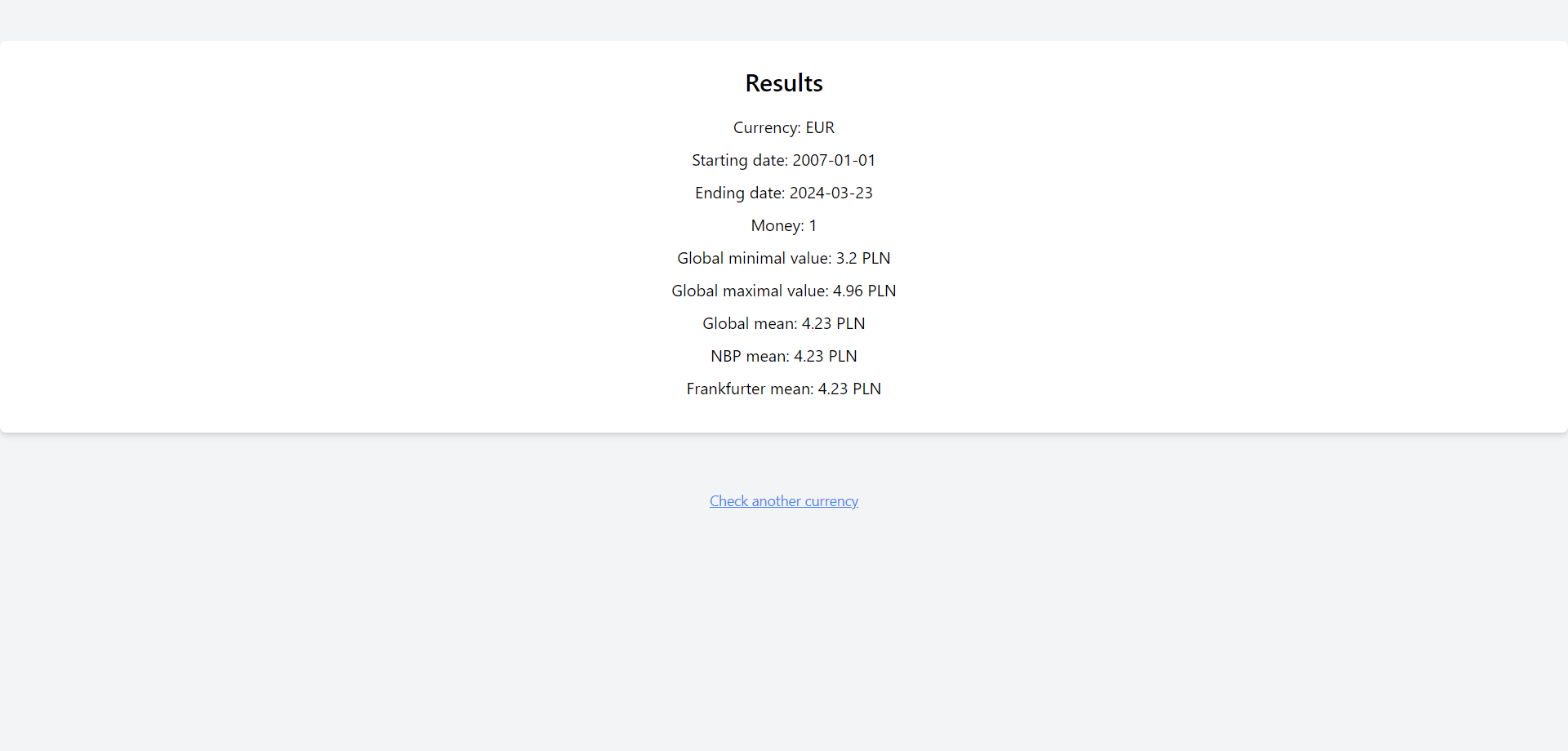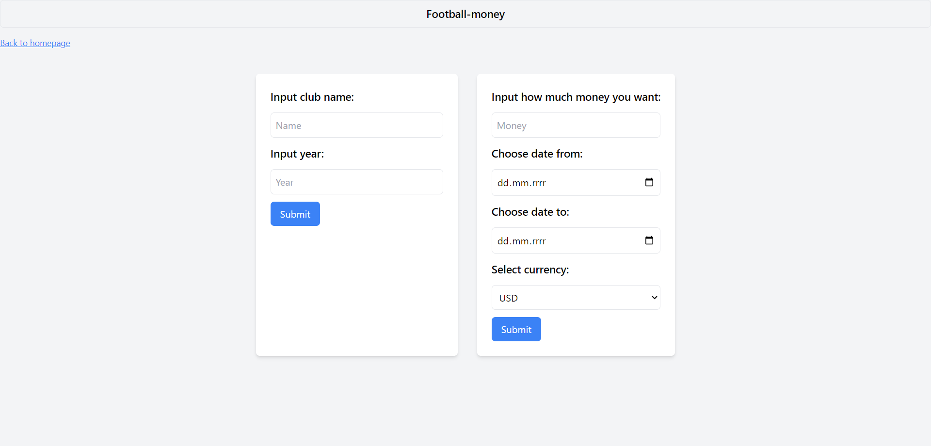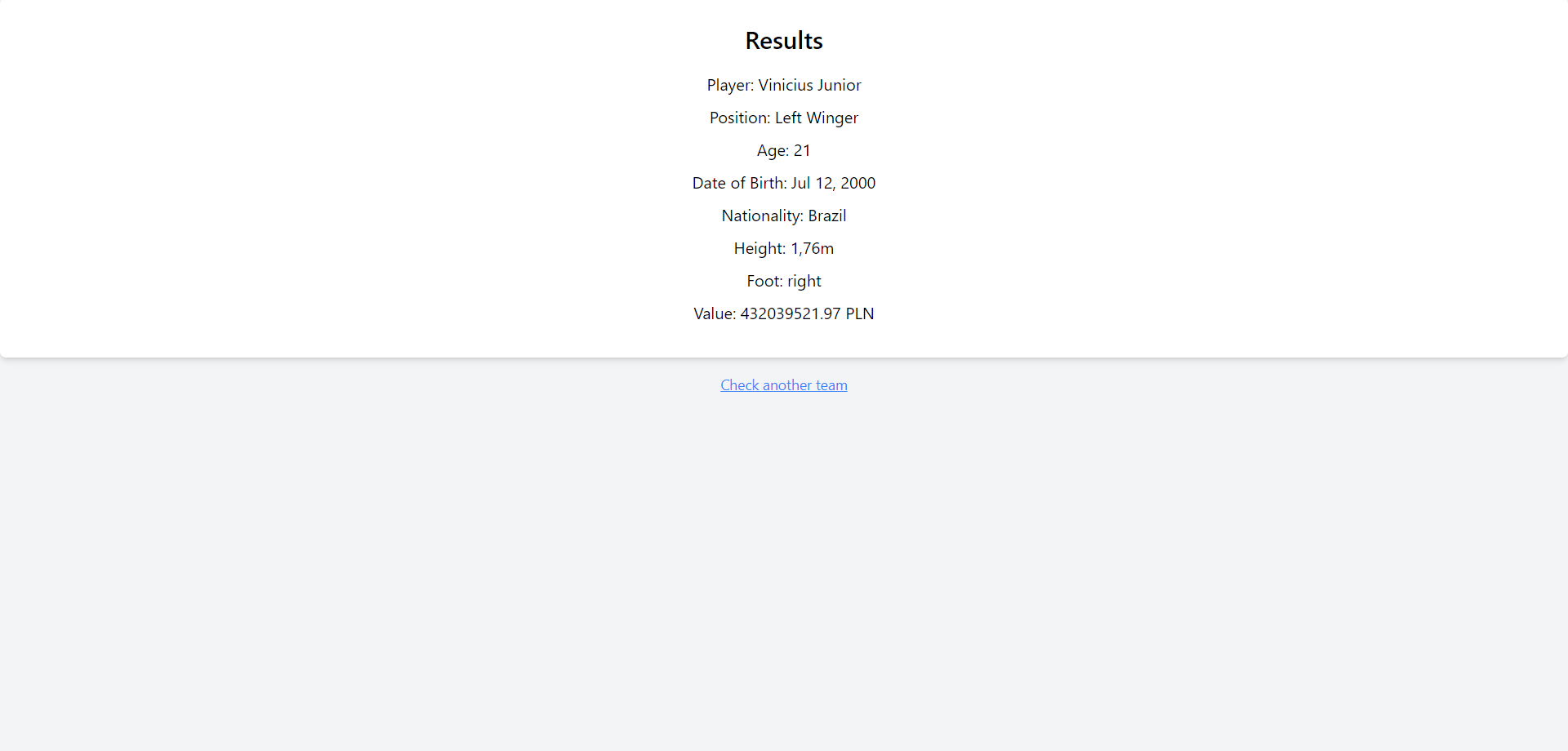 In my solution, there are two forms, one allowing to search for the most expensive football player in a given team, and the other allowing to convert Euro amount to PLN. I did it this way because I had a problem with the API fetching the player, as it was not working for a certain period. That’s why I made the second form, which allows to convert Euro amount to PLN, to have some backup solution.