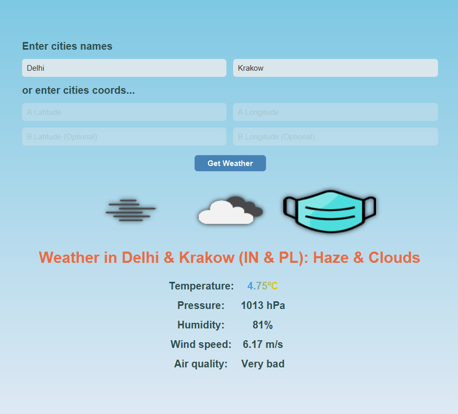 WeatherApp is implemented using Java and JavaFX. We also added API (OpenWeatherMap) which allows us to get weather. Within month, we created an application that implements several options to get weather, not only in one town but up to 4.